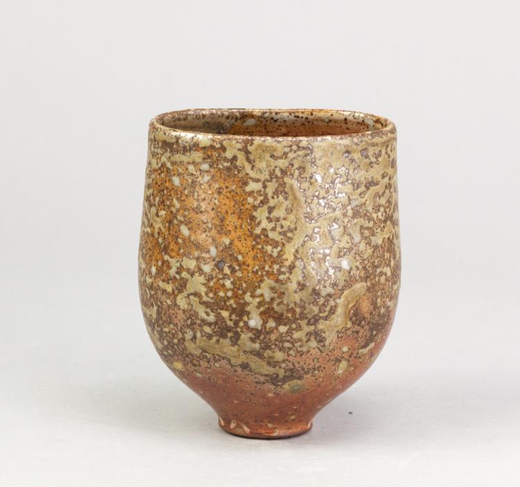 Lot 46 of 723: ALEX SHIMWELL (born 1980); a stoneware bowl squeezed to an oval at the rim covered in shino and ash glaze, side fired on shells, impressed S mark, height 14.5cm.