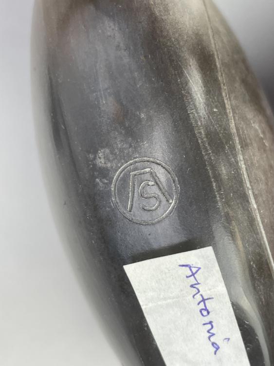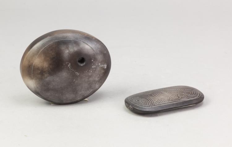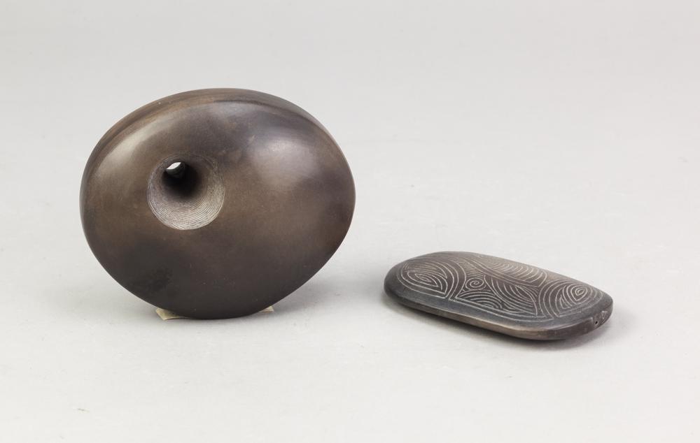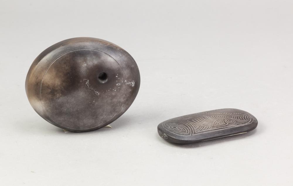 Lot 60 of 723: ANTONIA SALMON (born 1959); a small smoke fired stoneware pierced oval form, burnished with incised decoration, incised AS mark, height 10cm, and an incised small pebble (2). (D)