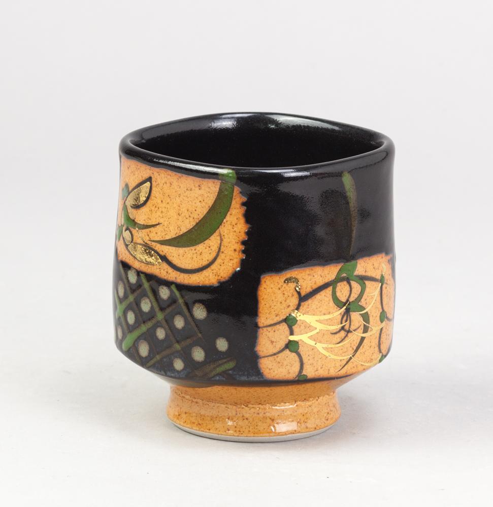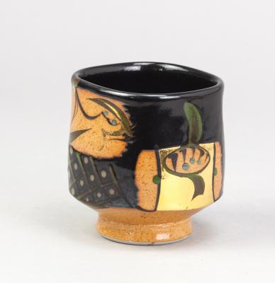 Lot 61 of 723: ARCHIE McCALL (born 1951); a stoneware yunomi covered in glossy black and mottled beige glaze with copper green and gold lustre decoration, painted AM mark, height 10cm. (D) Provenance: Purchased from the artist.