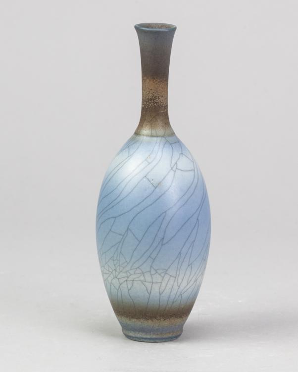Lot 157 of 723: DAVID JAMES WHITE (1934-2011); a small porcelain bottle covered in crackle and blended spray-on glaze, impressed DW mark, height 18.5cm. (D)