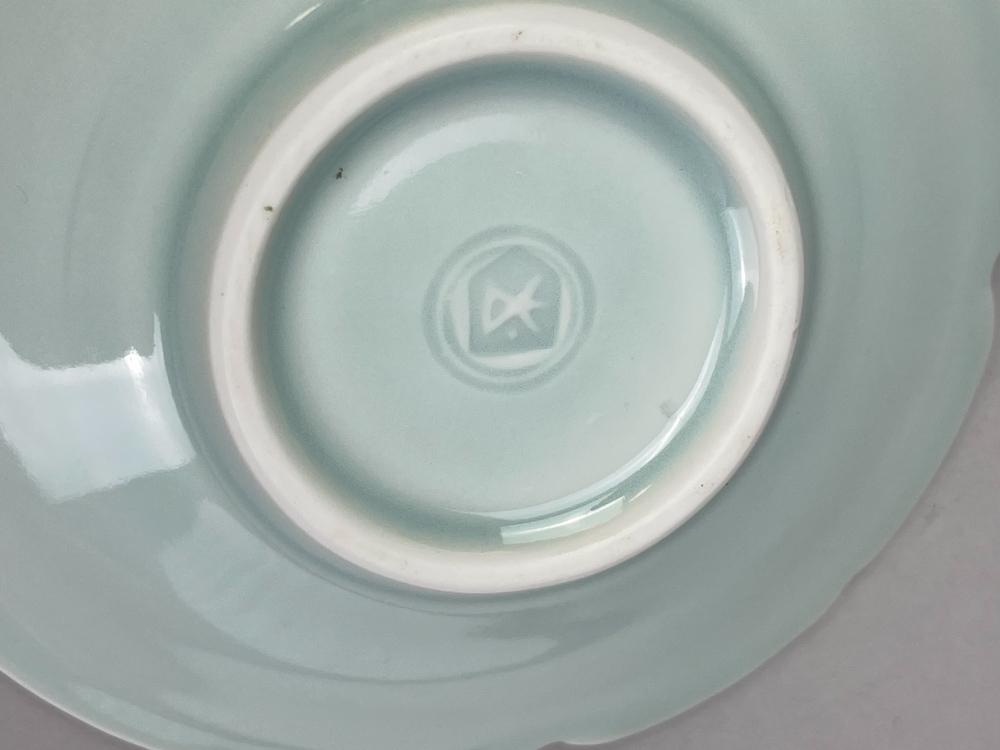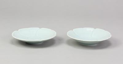 Lot 170 of 723: DEREK EMMS (1929-2004); a pair of dishes with scalloped rims covered in celadon glaze with incised decoration, impressed DE marks, diameters 13cm. (D)