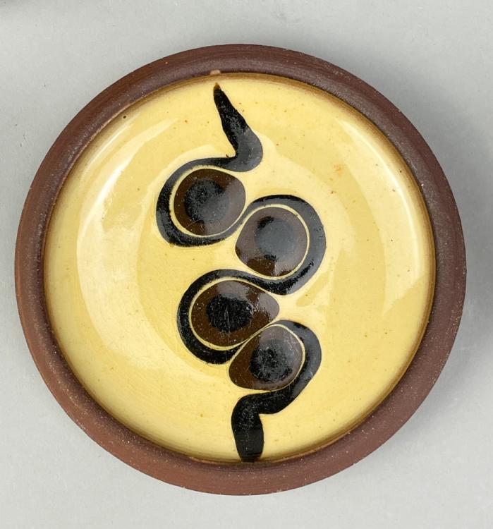 Lot 175 of 723: DON JONES (1936-2019); a group of ceramics including a cut sided stoneware cup, footed dish, bowl soup bowl and cover and a slipware pin dish, impressed DJ marks, largest diameter 13.5cm (5). (D)