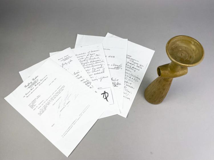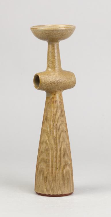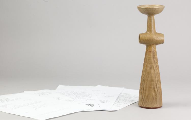 Lot 178 of 723: DOROTHY ANNAN (1908-1983); an earthenware anthropomorphic form covered in oatmeal glaze with incised decoration, incised AD mark, height 29cm, including also correspondence between the artist and Geoffrey Godden re her work and mark. (D) Annan was a painter, potter and mural artist. She became interested in ceramics in about 1949 and trained part time at the Central School in London for three years and afterwards sold through Heal and Sons and Primavera. She then applied her knowledge of ceram