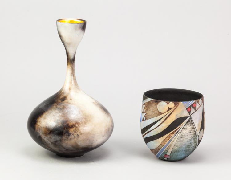 Lot 179 of 723: DUNCAN AYSCOUGH; a smoke fired stoneware vessel with narrow neck and cupped top, burnished and lightly incised decoration with gold leaf to cup, impressed DA mark, height 27.5cm, and a bowl with geometric decoration by another hand (2). (D)