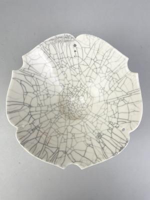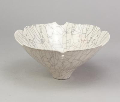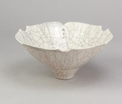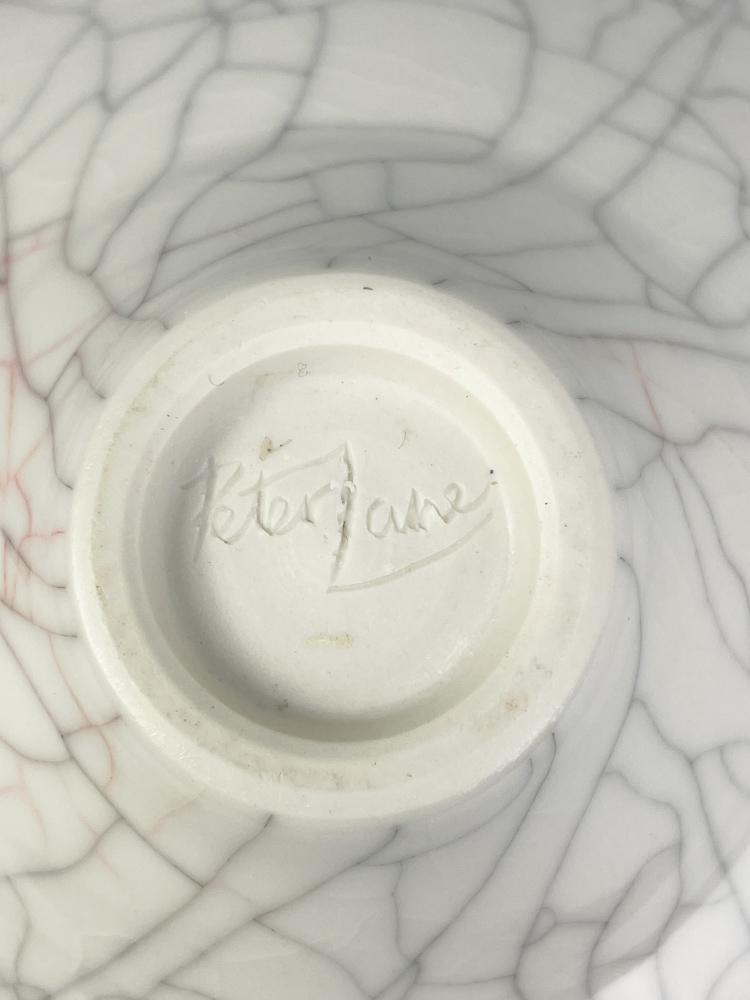 Lot 476 of 723: PETER LANE (born 1932); a pierced porcelain bowl with undulating rim covered in white and pink crackle glaze, incised signature, diameter 22.5cm. (D)