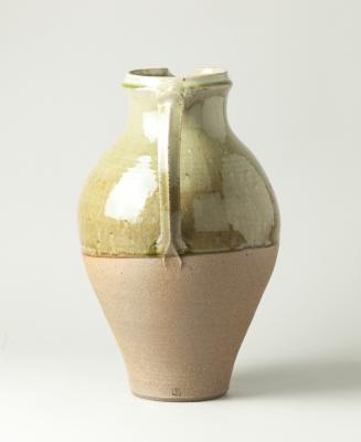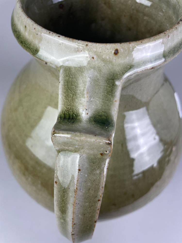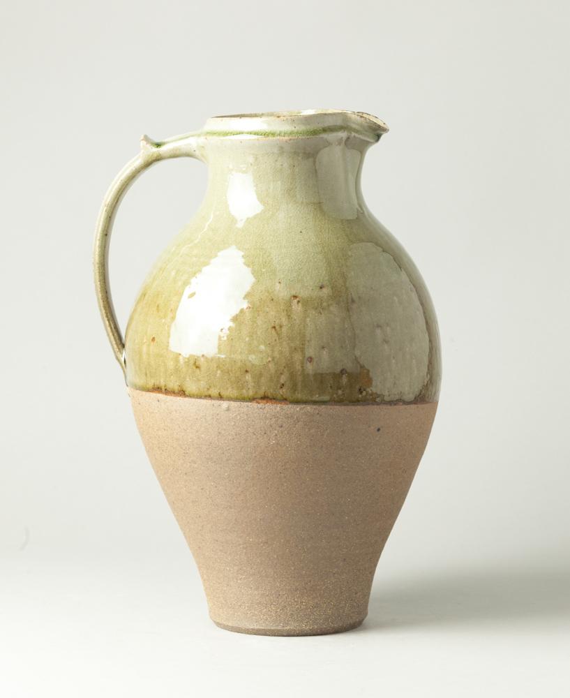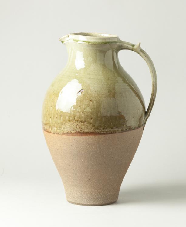 Lot 654 of 723: TOM KNOWLES JACKSON (born 1973); a large stoneware jug partially covered in green ash glaze with porcelain slip to neck, impressed TKJ mark, height 36cm.