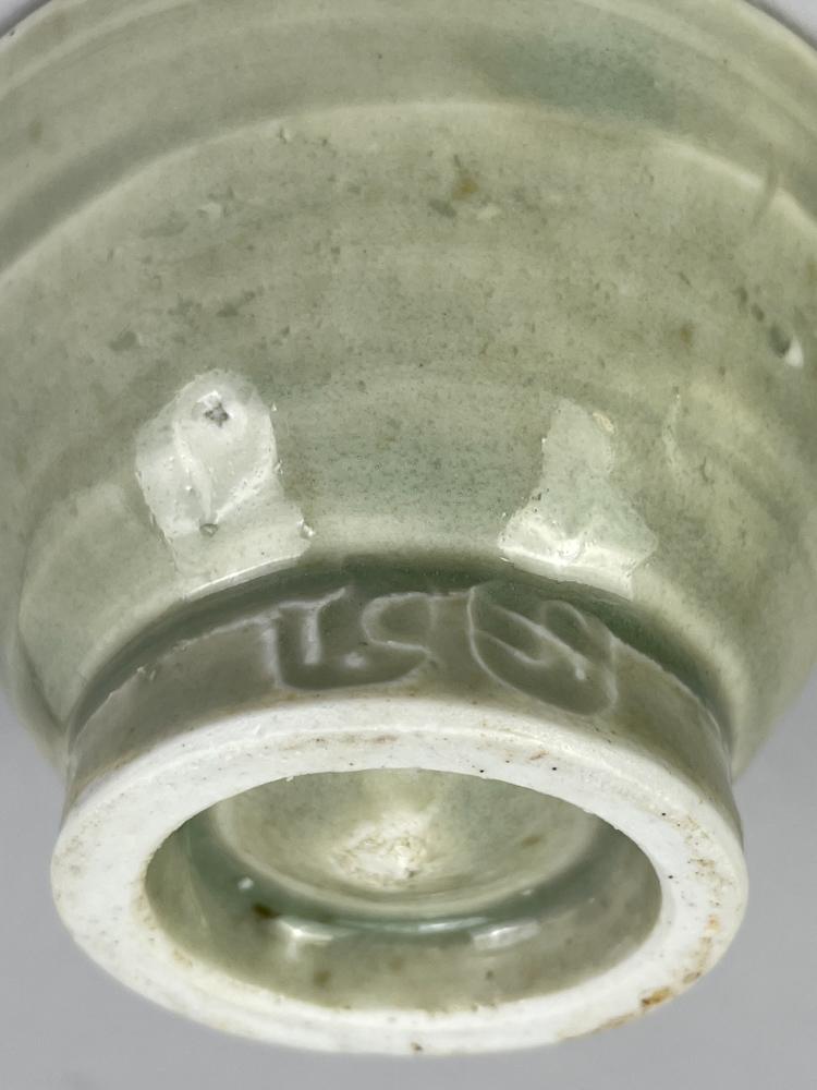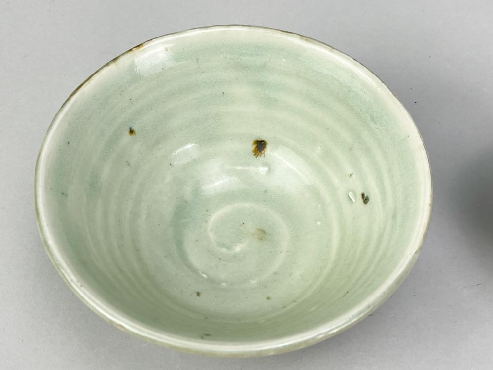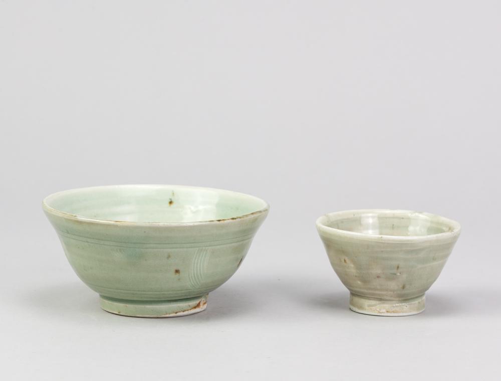 Lot 658 of 723: TREVOR CORSER (1938-2015) for Leach Pottery; a porcelain bowl covered in pale green glaze with incised decoration, impressed TC and pottery marks, diameter 13.5cm, and a smaller example with iron decoration to the well (2). (D)