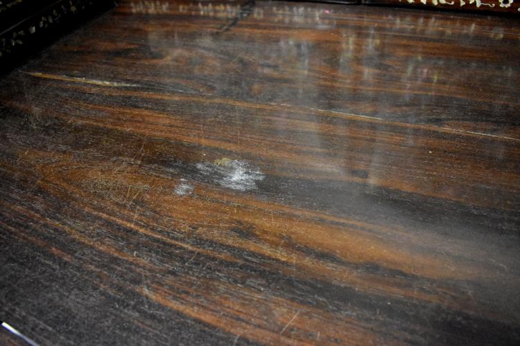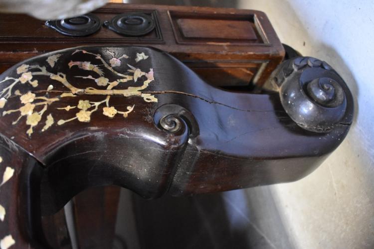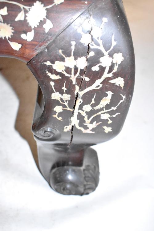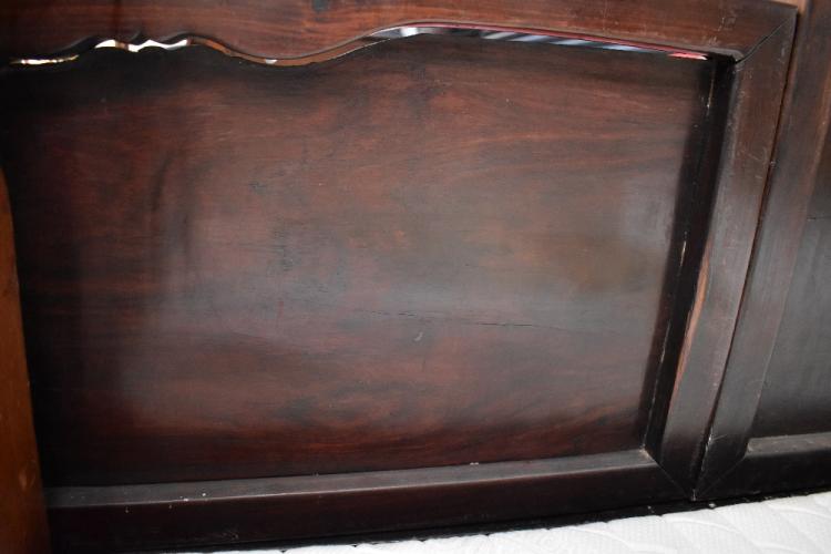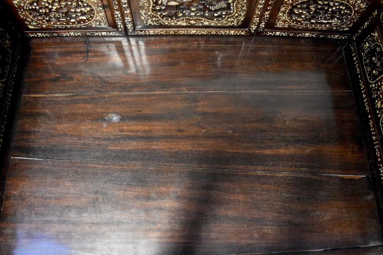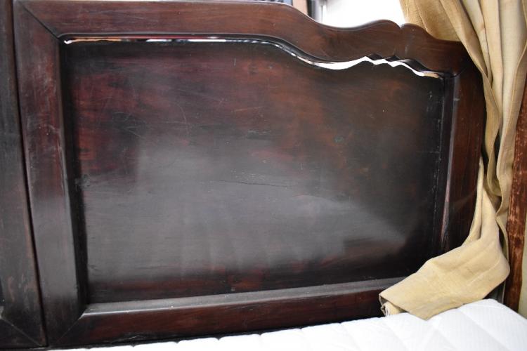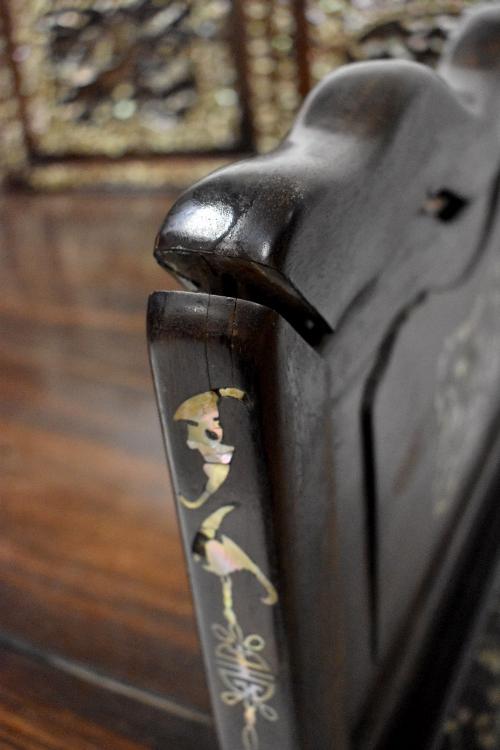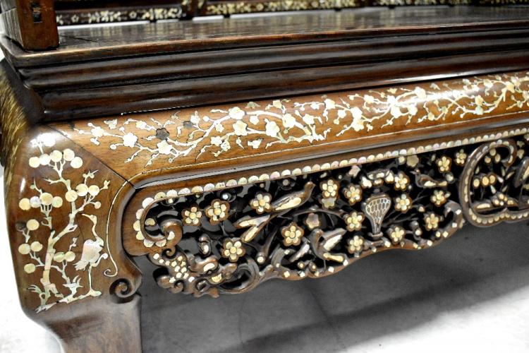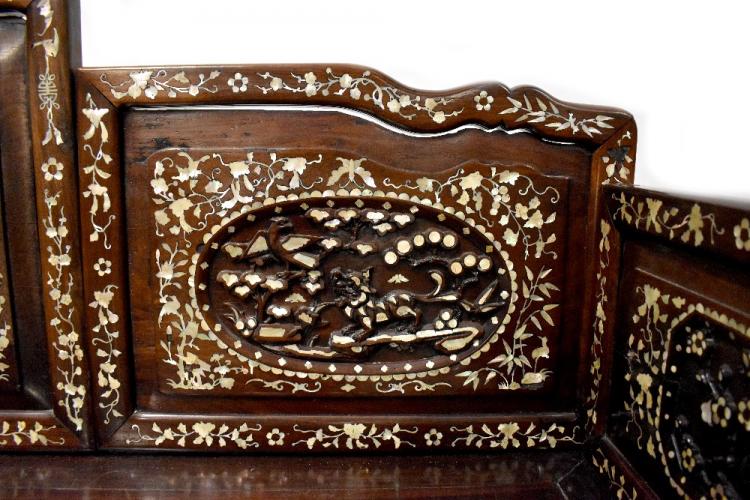 Lot 1 of 491: A mid-20th century Chinese mother of pearl inlaid opium bed, the three-panelled back with carved vignettes of animals within ornate borders, the arm rests with fan-shaped motifs carved with cherry blossom and bamboo above a base with carved frieze on scroll feet, 64 x 198 x 128cm.