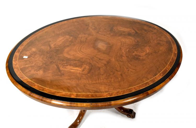 Lot 37 of 491: A Victorian walnut oval tilt-top dining table with inlay, on a bulbous turned column and quadruped base, 72 x 117 x 84cm.