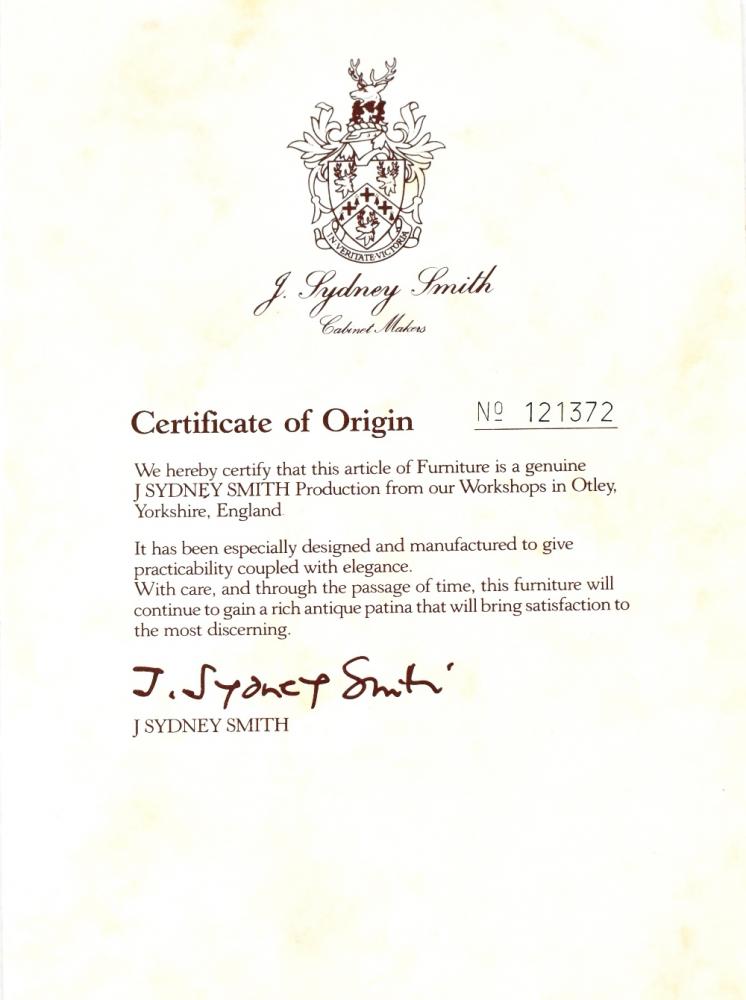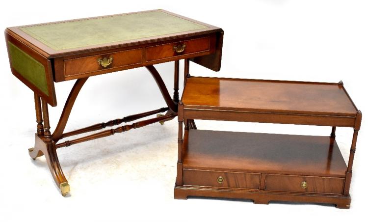 Lot 108 of 966: A modern mahogany reproduction sofa table with tooled green leather top over two drawers with brass drop handles, supported on brass capped outswept feet united by turned cross stretcher, on brass castors, height 78cm, length when extended 148cm and a modern mahogany coffee table with recessed top, raised on turned supports over shelf incorporating two single drawers on short bracket feet, height 54cm, length 86cm, width 46cm, both items retailed by J. Sydney Smith Ltd of Otley.