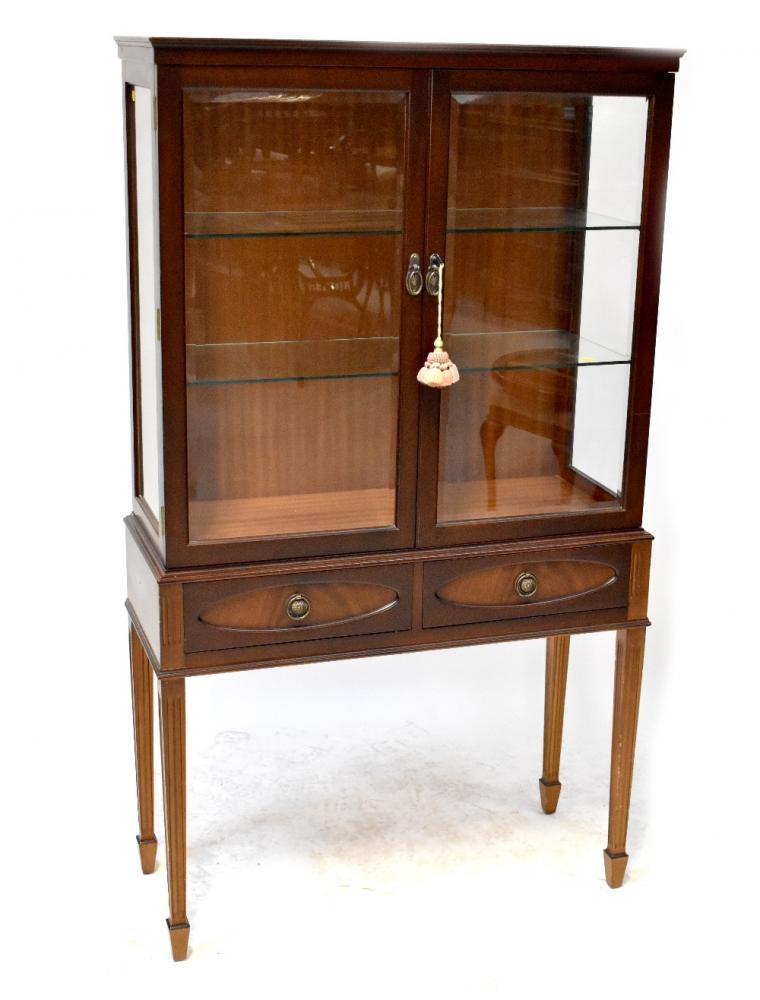Lot 110 of 966: A modern mahogany veneered glazed display cabinet with two inner glass shelves, bevelled edge glass to the doors, over two drawers, on tapered supports, height 158cm, width 91cm.