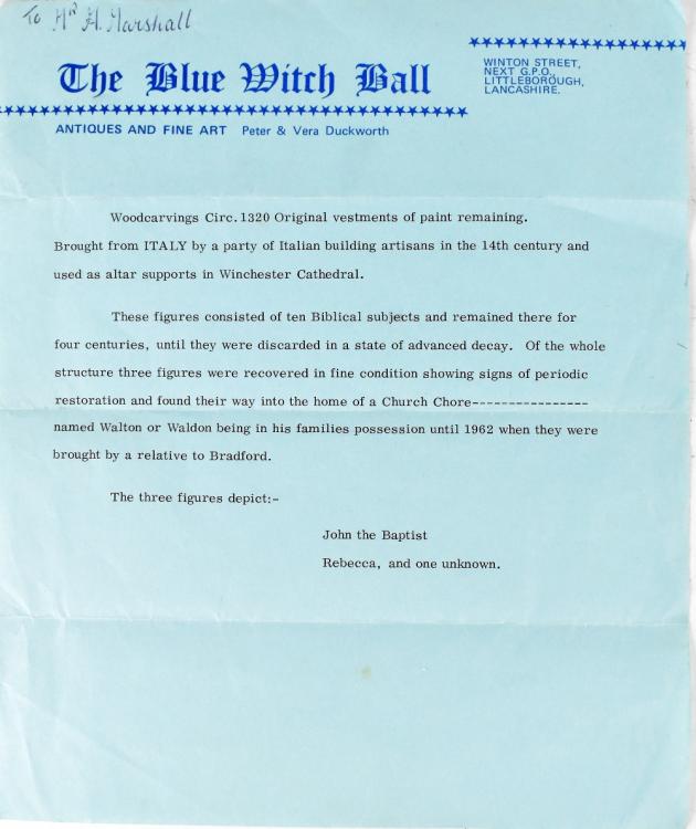 Lot 115 of 966: Carved wood panels to include three reputedly used as altar supports in Winchester Cathedral after being originally gifted from Italian building artisans in the 14th century, the structure was discarded from Winchester Cathedral when considered to be in a state of advanced decay these three panels were apparently saved, they were later bought from 'The Blue Witch Ball' antiques shop and listed as John the Baptist, Rebecca and one unknown, original receipt supplied, height each approx 47cm, also