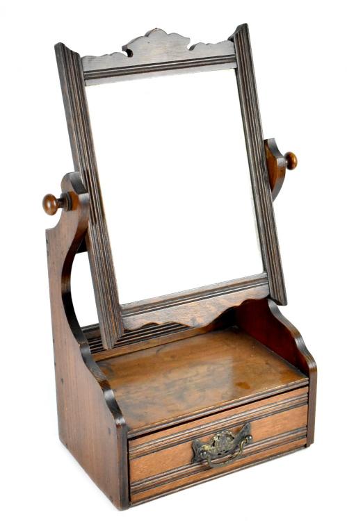 Lot 117 of 966: An Edwardian oak swing toilet mirror with rectangular plate above a base with single drawer, 56 x 36 x 19cm.