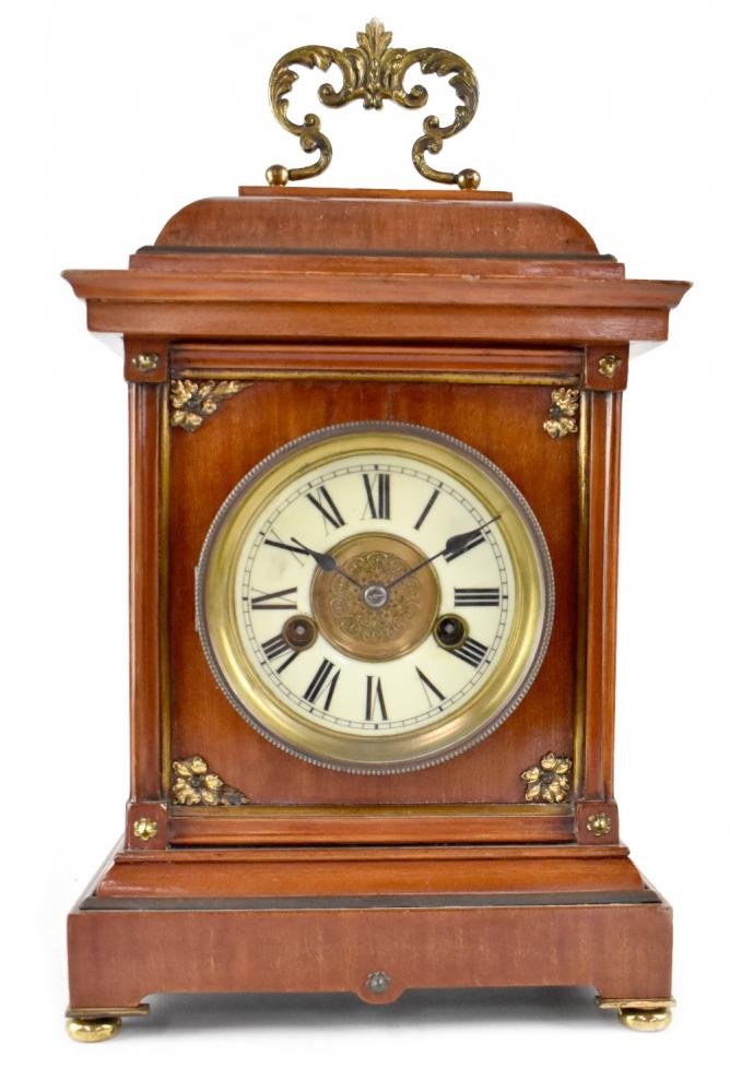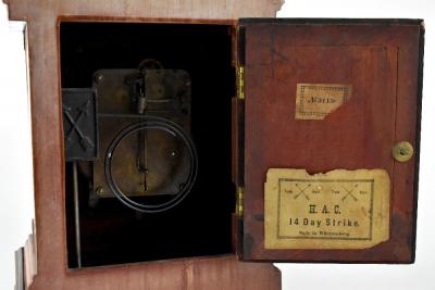 Lot 138 of 966: H A C; an early 20th century German fourteen-day strike mantel clock, the enamelled and gilded dial set with black Roman numerals, height 36cm.