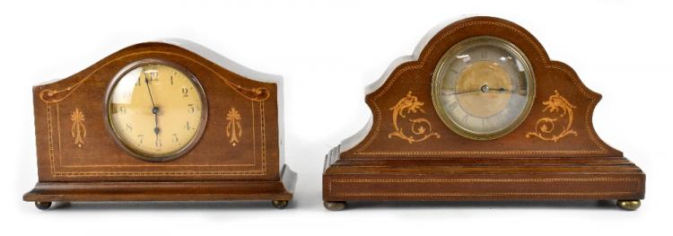 Lot 140 of 966: An Edwardian inlaid mahogany mantel clock, the dial set with Roman numerals within an arched top case with inlaid scroll motif, on brass ball feet, height 16cm, and a similar example with scalloped arched top and dial set with Roman numerals, on brass feet, height 19cm (2).