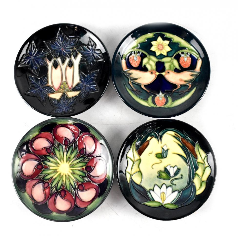 Lot 301 of 966: Four modern Moorcroft pin dishes, patterns to include 'Cluny', 'Strawberry Thief', 'Lamina' and 'Tulip', diameter of each 12cm, all bearing impressed factory marks and ciphers for year and artist (4).