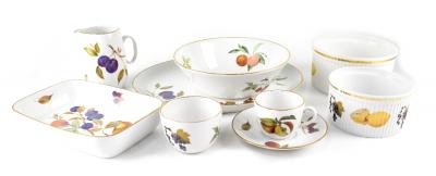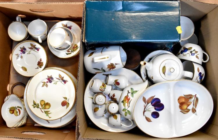 Lot 303 of 966: A large quantity of Royal Worcester 'Evesham' pattern dinner and table ware to include a large lidded oval tureen, cups and saucers, salt and pepper cruets, coffee cups, jugs, gravy boat and saucer, hors d'oeuvres dish (boxed), teapot, coffee pot, egg coddlers, etc (approx 120 pieces).
