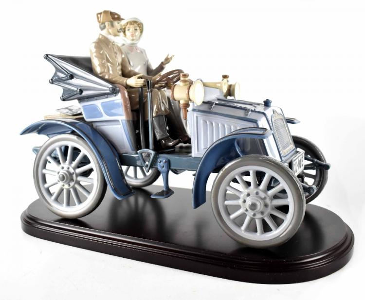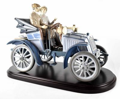 Lot 306 of 966: A Lladró limited edition figure group 5884 'Motoring in Style', depicting a couple in a vintage car, on wooden base and with framed certificate, signed, no.243/1500, length 38cm, with original box.