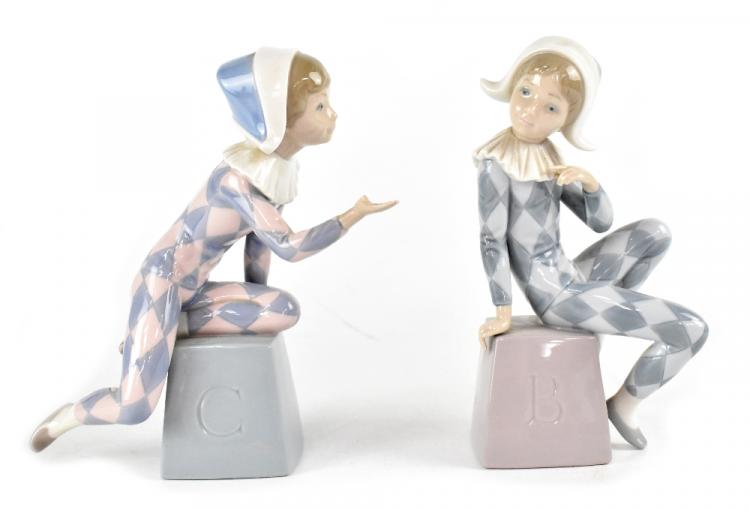 Lot 307 of 966: A pair of Lladró harlequin clowns on alphabet box, 'B' and 'C', stamped to base, height 21cm (2).