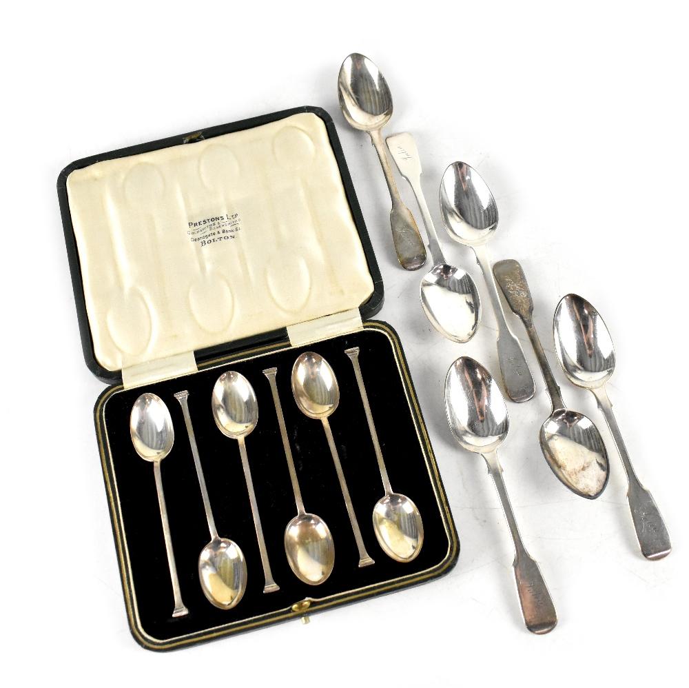 Lot 649 of 966: A set of six Victorian hallmarked silver teaspoons, Charles Boyton, London 1845, each engraved with the name Julia to the top of the handle and a cased set of six hallmarked silver teaspoons by Cooper Brothers, Sheffield 1926, combined approx 5.6ozt.