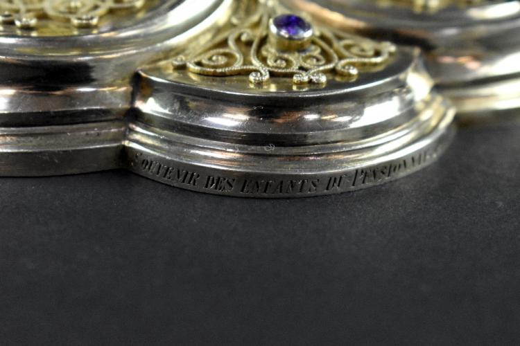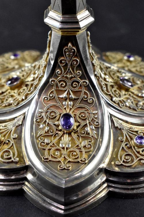 Lot 652 of 966: Attributed to Placide Poussielgue Rusand (1824-1889); a 19th century French silver gilt three-piece altar set, a chalice ciborium and paten, the chalice and ciborium with fine applied filigree of foliage, scrolls and grapes, the slender stem with engraved cross and lattice decoration, central octagonal knop set with facet amethysts, to an octagonal floral shaped stepped base, height 23cm, a matching ciborium with jewelled cross to cover, height 30cm, the two set with numerous oval and round amet