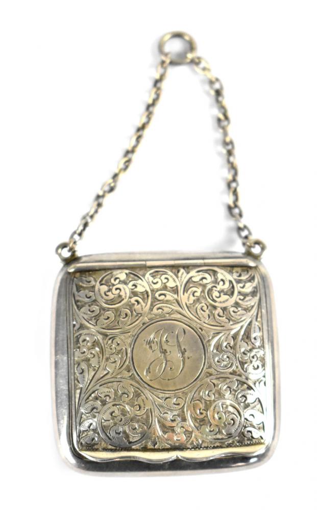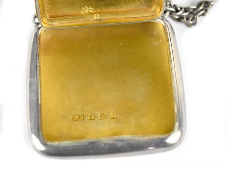 Lot 659 of 966: An Edwardian hallmarked silver snuffbox, Birmingham 1910, William Neale, central cartouche with the initials 'JJ' within a chased floral pattern front and back, gilt interior, suspended on a small chain, approx. 0.84ozt.