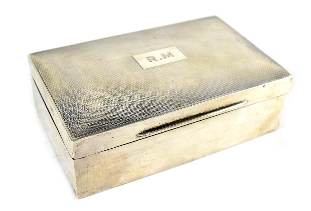 Lot 661 of 966: An Edwardian, hallmarked silver cigarette box with soft wood liner (lacking partition), engine turned top with central panel bearing the initials 'RM', Dingley Brothers 1902, length 14cm, width 9cm, height 4.6cm, approx 6ozt.