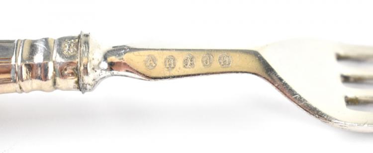 Lot 673 of 966: A set of six hallmarked silver handle dessert knives and forks, marks rubbed.