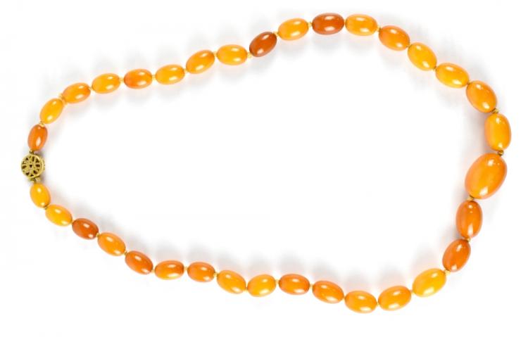 Lot 719 of 966: A butterscotch amber bead necklace with a 9ct yellow gold fancy clasp, largest bead 15 x 12mm, total length 56cm, approx 34.6g.