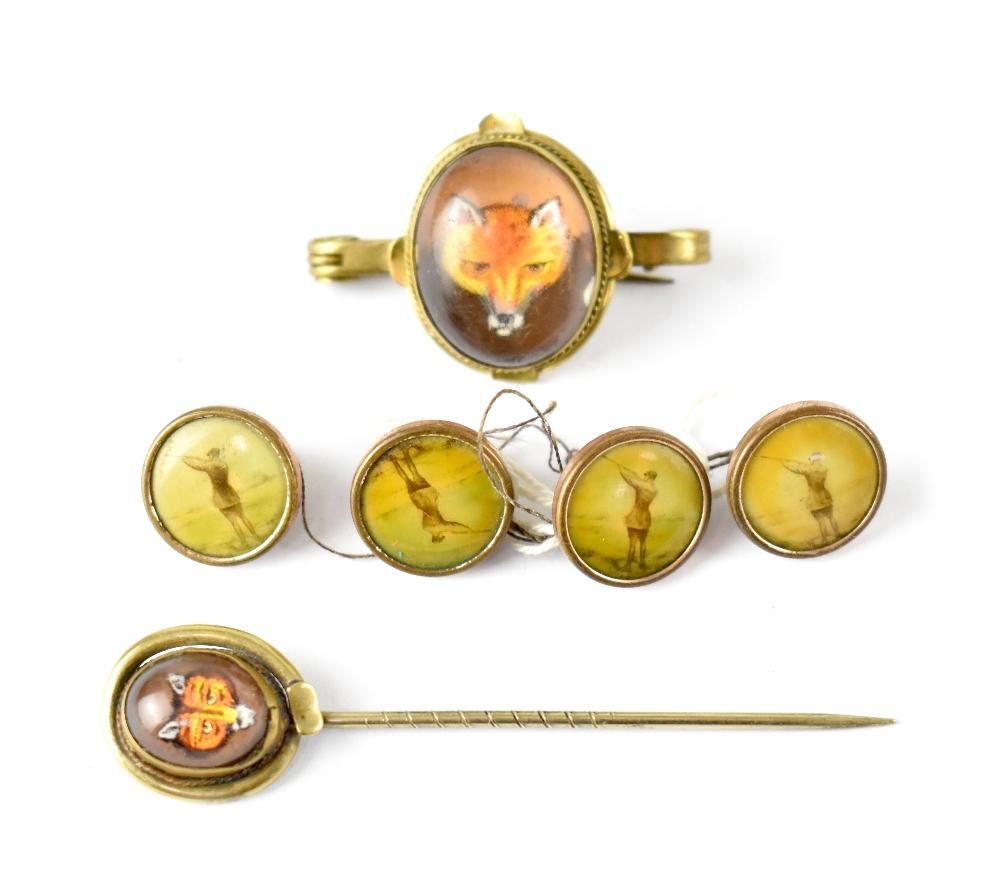 Lot 725 of 966: A set of four Edwardian buttons with the image of a gentleman shooting, together with a fox head brooch and fox head pin (6).