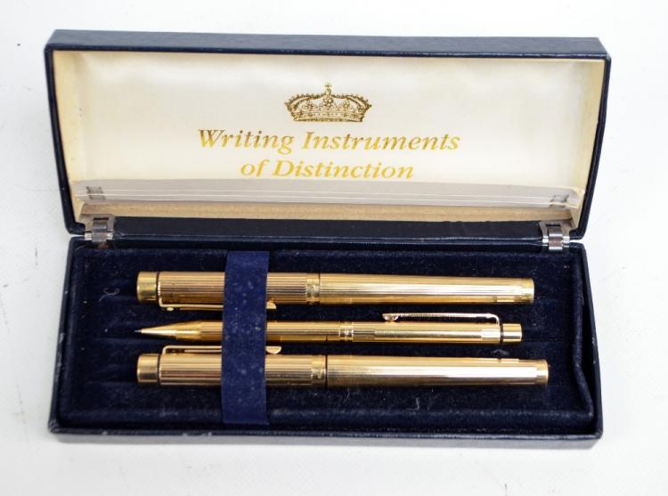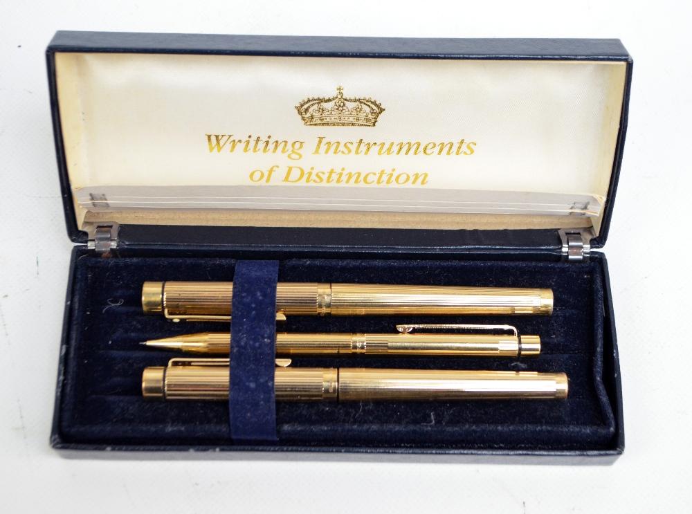 Lot 55 of 2297: Three Sheaffer gold plated writing instruments, a fountain pen with nib stamped '585 14K', a ball point pen and a pencil (with lead) (3).