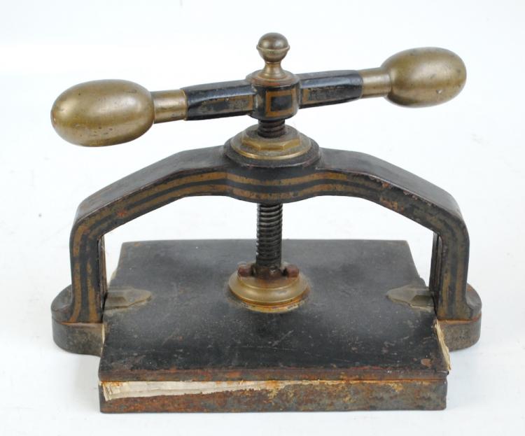 Lot 58 of 2297: A late 19th century cast iron table top book press with brass fittings and manufacturer's label reading 'Waterlow & Sons Ltd London E.C', height 30.5cm, length 41cm.