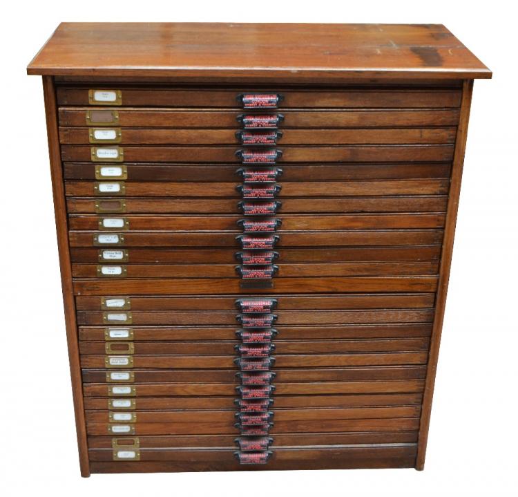 Lot 62 of 2297: A c.1900 walnut twenty-three drawer cabinet for lead printing blocks, still containing a huge number of printing blocks and with handles inscribed 'John Haddon & Co, London, Sydney & Toronto', width 93cm.