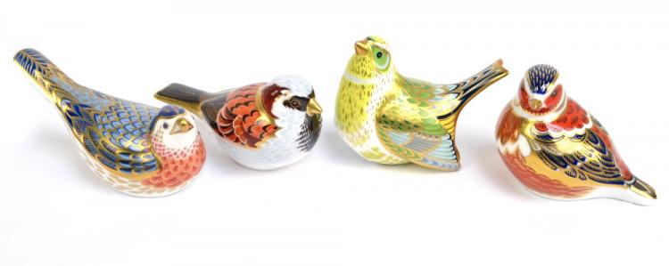 Lot 729 of 2297: Four Royal Crown Derby paperweights, 'House Sparrow', 'Bluebird', 'Green Finch' and 'Chaffinch', all with gold plugs, boxed (4).