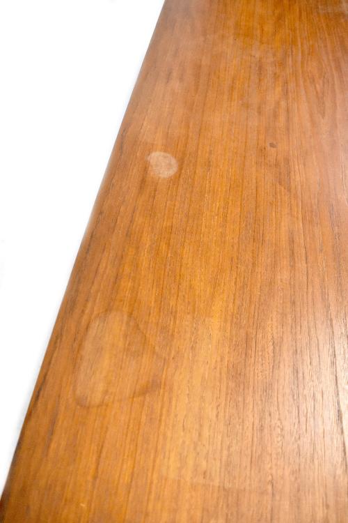 Lot 1 of 898: A Dalescraft, retailed by Matthews, 1960s retro teak dining suite comprising an extending dining table with three additional leaves stored inside, extended 73 x 286cm, six rail back dining chairs upholstered in black and white woven fabric and a sideboard with four drawers and a pair of sliding cupboard doors, on round tapering legs, 79 x 198 x 46cm.