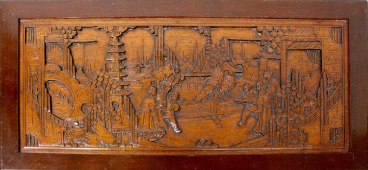 Lot 12 of 898: A Chinese camphor wood blanket box with carved panels depicting figures within landscapes, on bracket feet, height 57cm, width 101cm, depth 51cm.