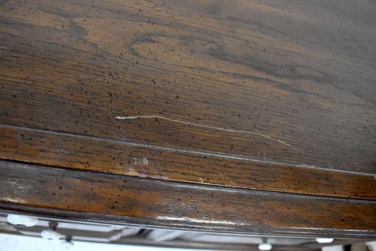 Lot 16 of 898: An oak-effect dresser base comprising nine fielded and panelled drawers with ceramic handles, on carved feet, height 80cm, width 200cm, depth 51cm.