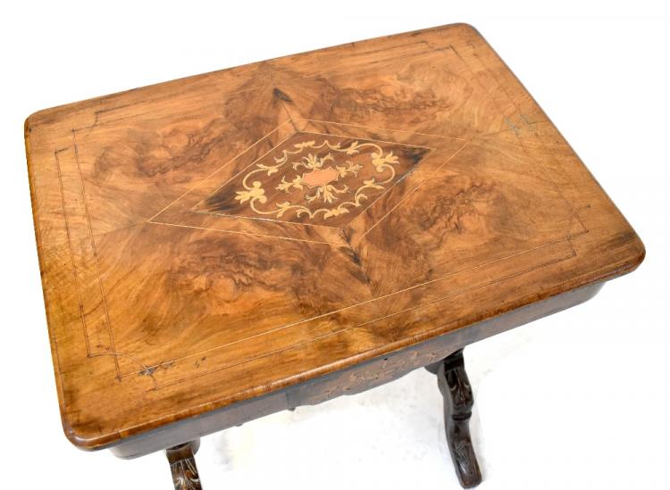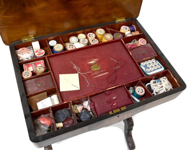 Lot 17 of 837: A Victorian inlaid walnut sewing table with original card partitions and silk-covered storage boxes, containing a quantity of vintage sewing aids, to turned and outswept supports and cross stretcher, 72 x 55cm.