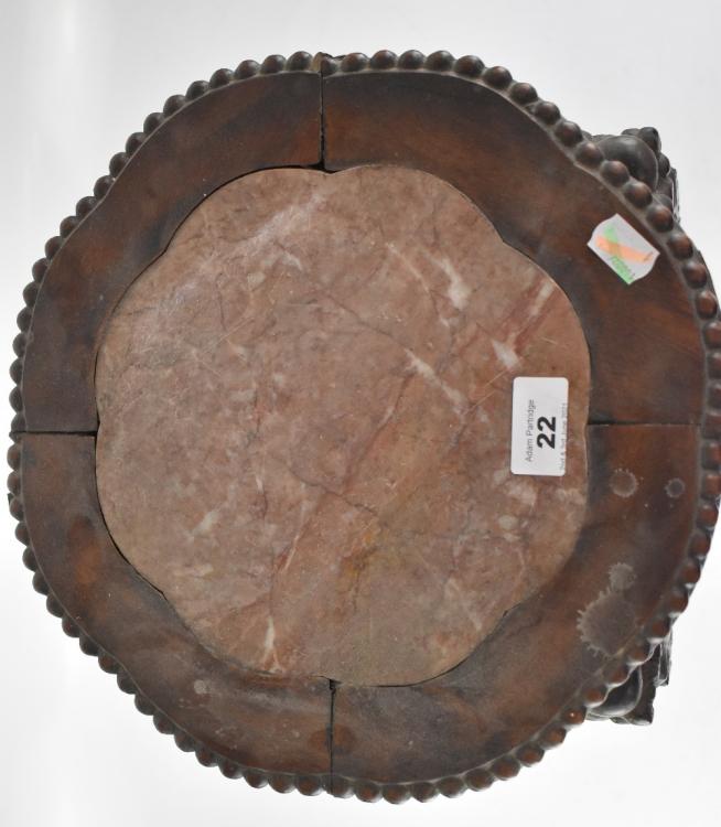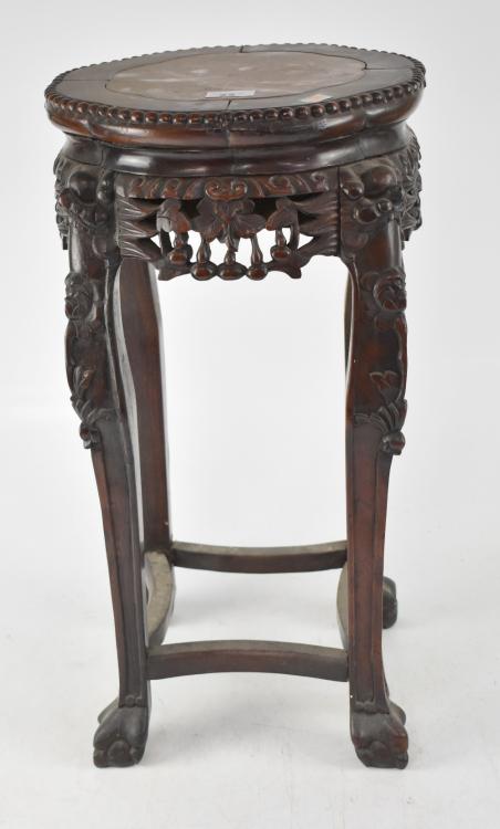 Lot 22 of 837: A late 19th century Chinese hardwood small urn stand with pink marble insert top, on a carved base united by stretchers, height 61cm, diameter 32cm.