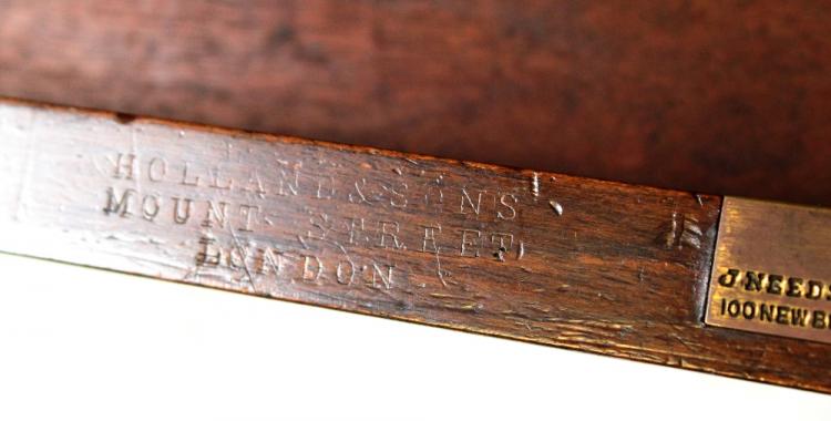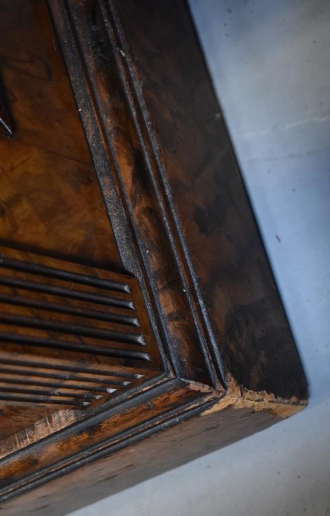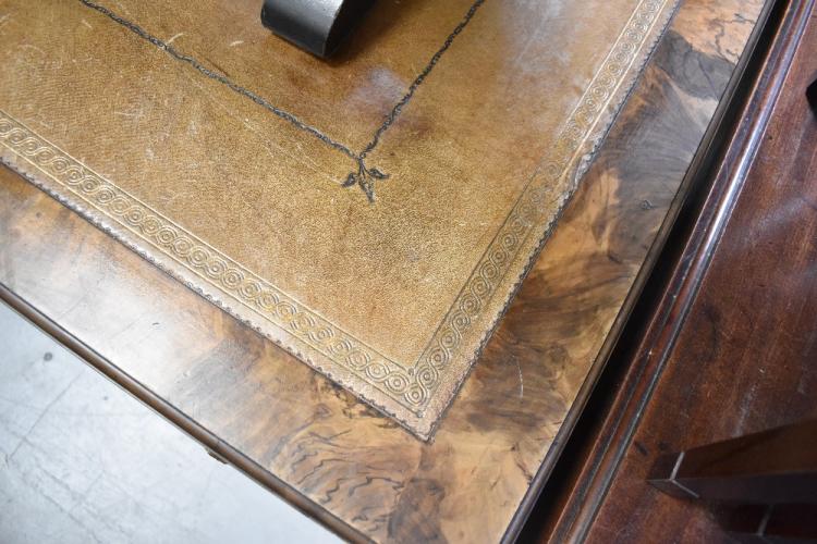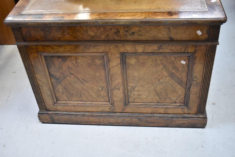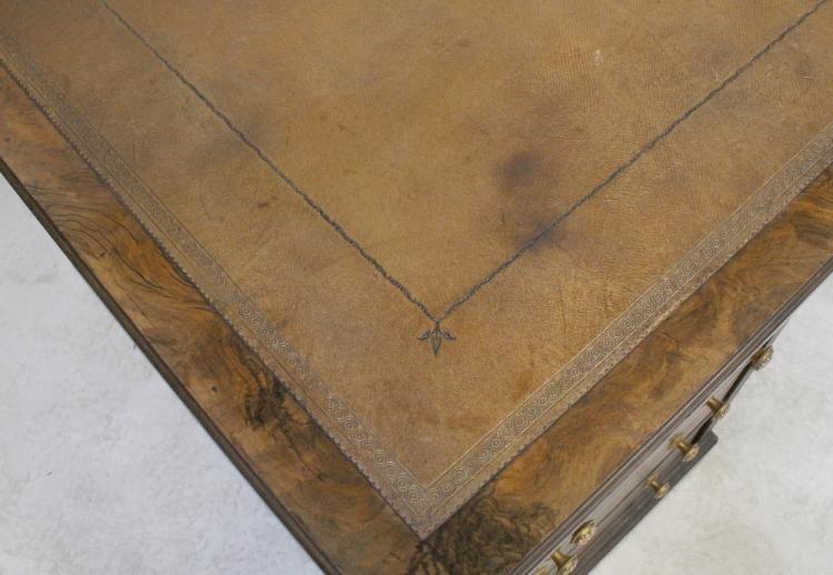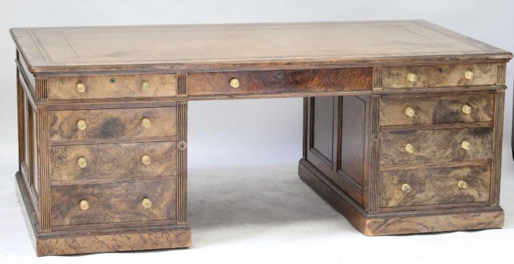 Lot 25 of 837: A large Victorian walnut partner's desk, with amber and gilt tooled leather insert top, central long drawer with drawer to either side, all with Bramah locks, with panelled door to either side, reverse the same with three drawers to either side, on stepped plinth base, 76 x 197 x 107cm.