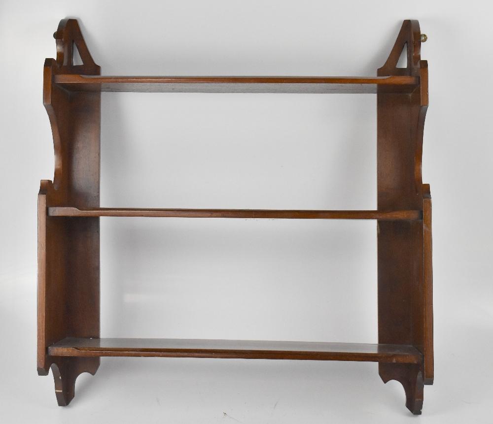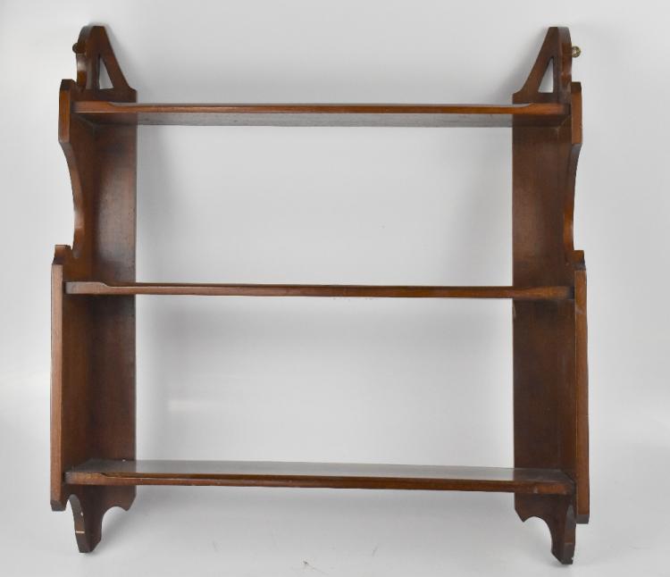 Lot 55 of 837: An early 20th century mahogany wall shelf comprising three shelves on pierced uprights, 66.5 x 61cm.