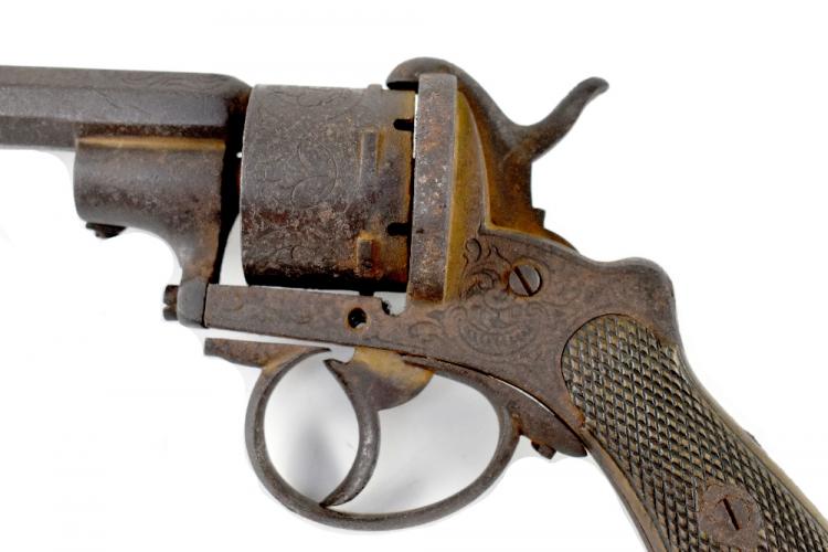 Lot 446 of 837: A 19th century Belgian pin fire revolver with chequered walnut grip.