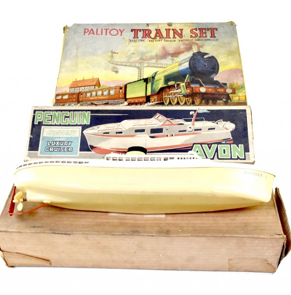 Lot 483 of 837: A Tri-ang battery operated model boat 'Avon', length 44cm, fitted in original box, a similar Tri-ang battery operated model boat 'Orcades' and a part complete Palitoy train set.