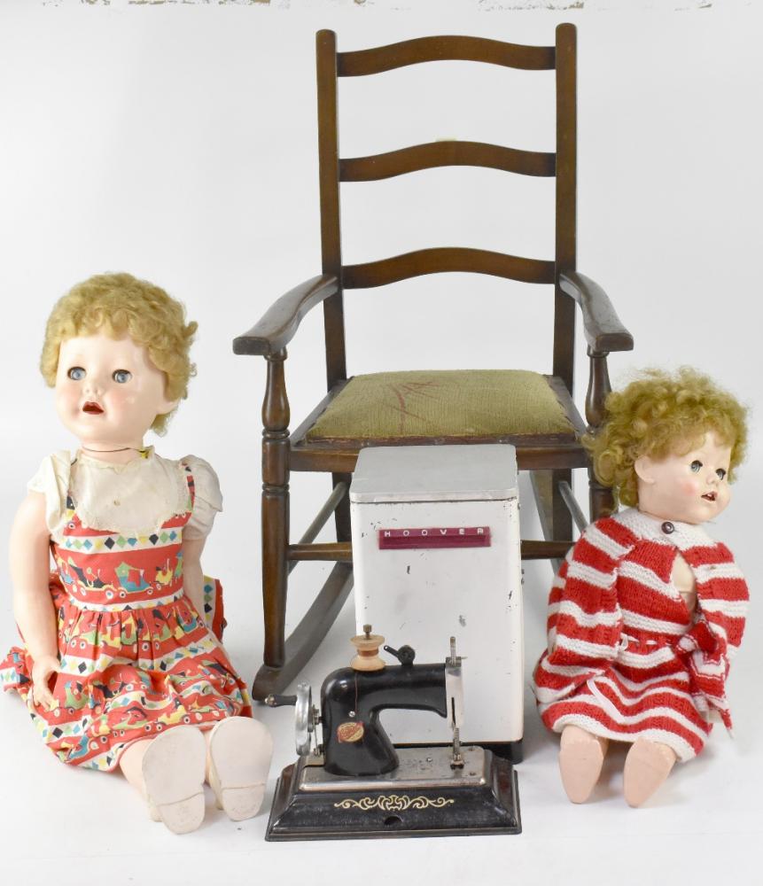 Lot 484 of 837: Various vintage toys to include two dolls, a rocking chair, a child's sewing machine and a child's play washing machine (5).