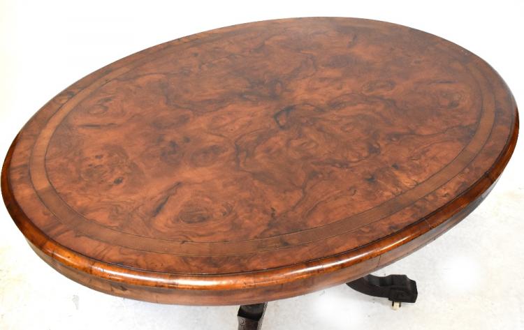 Lot 13 of 1291: A Victorian walnut oval tilt-top table on four turned column base, with outswept carved legs, 72 x 132 x 99cm.