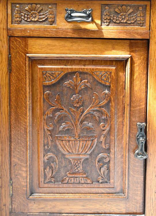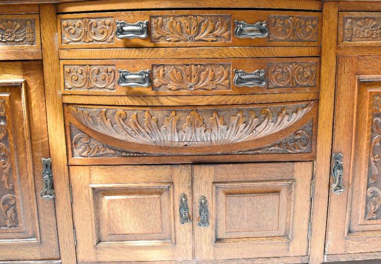 Lot 27 of 1291: A large Victorian carved oak mirror back sideboard, the upper section mounted with a broken swan neck pediment carved with acanthus leaf decoration above triple bevelled mirror plates, with an assortment of shelves and carved acanthus leaf baluster supports, above a base with bowed central section comprising two drawers above two fielded panelled doors flanked by a drawer above a further fielded panelled door, raised on turned feet, with profuse swag, urn and acanthus leaf carving, 230 x 184 x 5