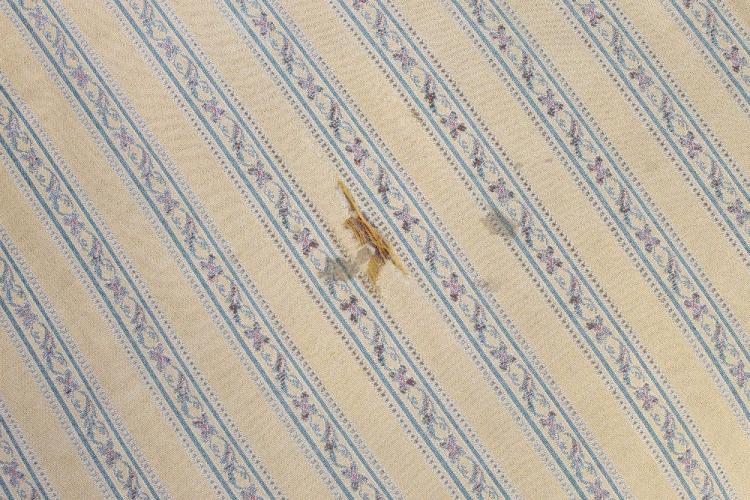 Lot 31 of 1291: A Victorian sofa with deep button back to scrolling arms, on mahogany turned supports and castors, upholstered in Empire-style yellow and blue floral striped fabric, length 180cm.
