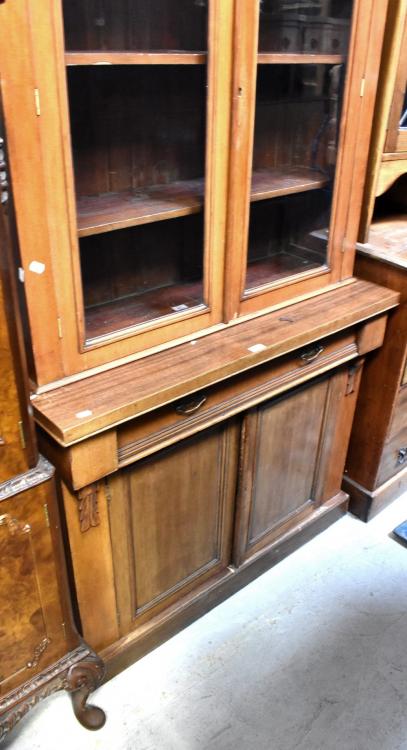 Lot 41 of 1291: A 19th century mahogany break-front chiffonier bookcase, the top comprising a pair of glazed doors enclosing three adjustable shelves and flanked by simple carved detail above a base of one long drawer and two panelled doors, raised on plinth base, height approx 200 x 104 x 41cm.