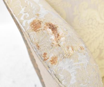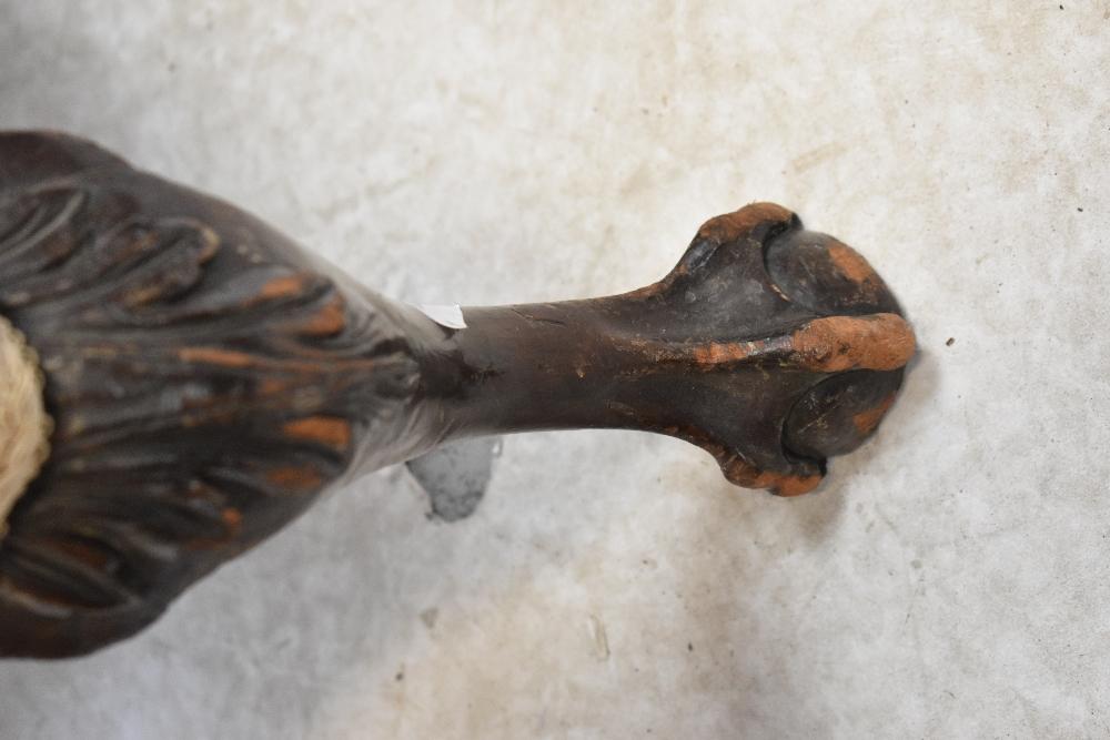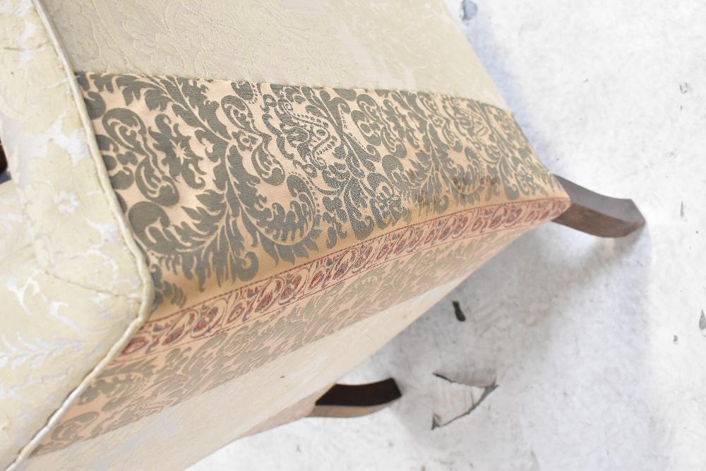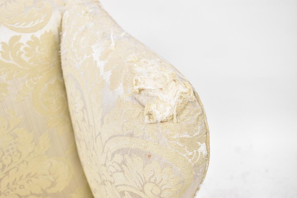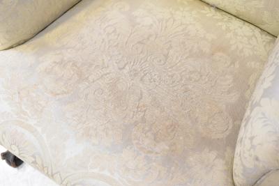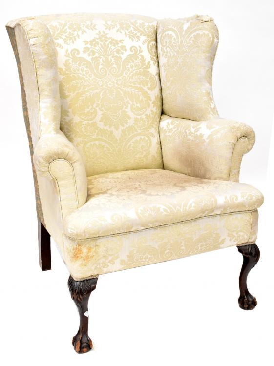 Lot 59 of 1291: A 19th century mahogany wing back armchair upholstered in a cream sateen fabric, on carved cabriole legs with claw and ball feet.