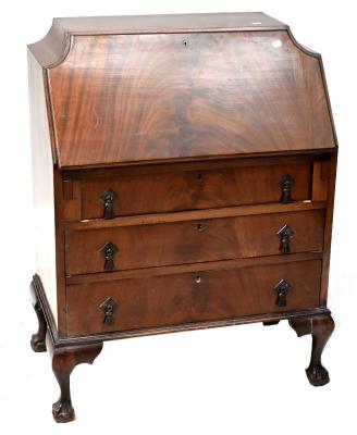 Lot 122 of 1291: A mid-20th century mahogany bureau with shaped top and fitted interior over three long graduated drawers, on cabriole legs with ball and claw feet, 104 x 77cm (af).